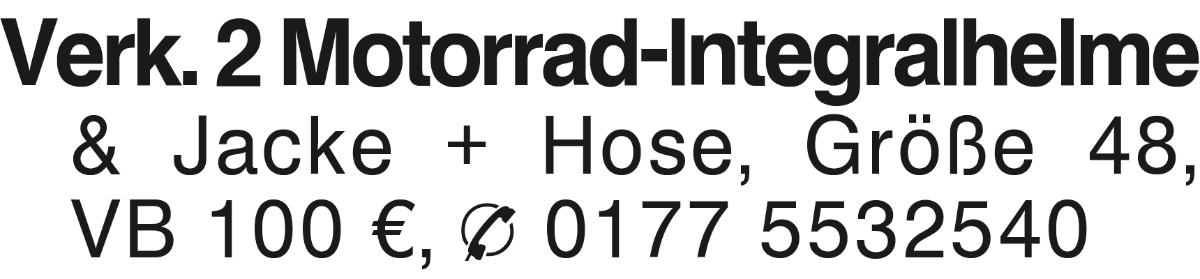 Verk. 2 Motorrad-Integral Verk. 2 Motorrad-Integralhelme & Jacke + Hose, Größe 48, VB 100 EUR, 0177 5532540Das könnte Sie auch interessieren