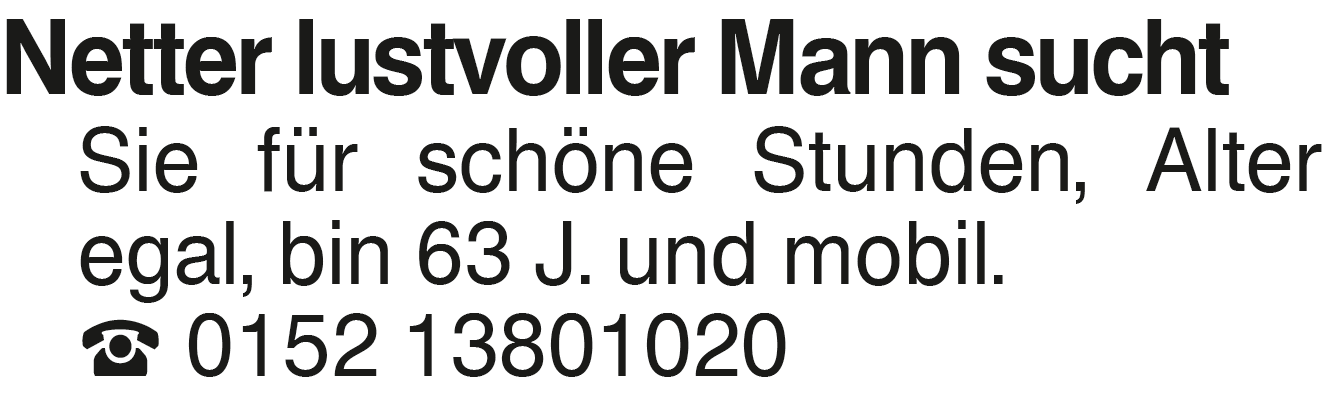 Netter lustvoller Mann su Netter lustvoller Mann sucht Sie für schöne Stunden, Alter egal, bin 63 J. und mobil. 0152 13801020Kontakt