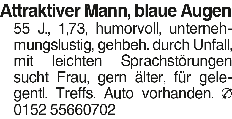 Attraktiver Mann, blaue A Attraktiver Mann, blaue Augen 55 J., 1,73, humorvoll, unternehmungslustig, gehbeh. durch Unfall, mit leichten Sprachstörungen sucht Frau, gern älter, für gelegentl. Treffs. Auto vorhanden. 0152 55660702Das könnte Sie auch interessieren