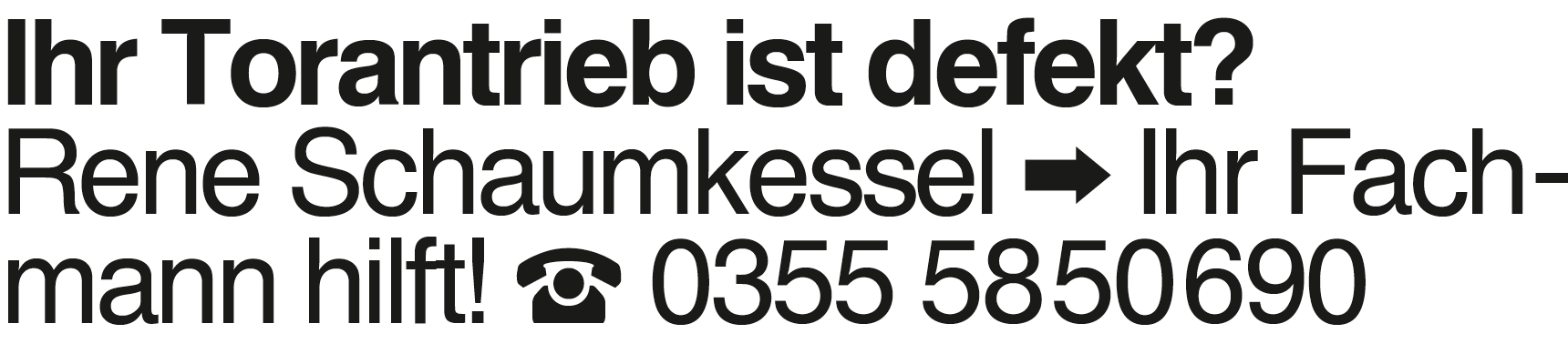 Ihr Torantrieb ist defekt Ihr Torantrieb ist defekt? Rene Schaumkessel Ihr Fachmann hilft! 0355 58 50 690Das könnte Sie auch interessieren
