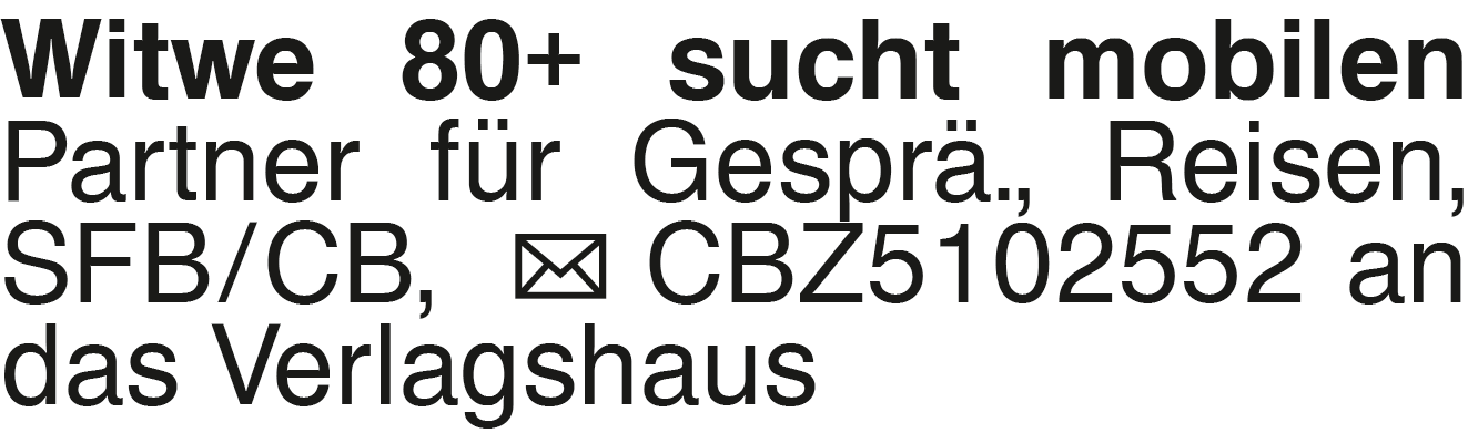 Witwe 80+ sucht mobilen P Witwe 80+ sucht mobilen Partner für Gesprä., Reisen, SFB/CB, CBZ5102552 an das Verlagshaus