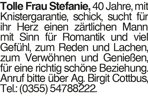 Stefanie Tolle Frau Stefanie, 40 Jahre, mit Knistergarantie, schick, sucht für ihr Herz einen zärtlichen Mann mit Sinn für Romantik und viel Gefühl, zum Reden und Lachen, zum Verwöhnen und Genießen, für eine richtig schöne Beziehung. Anruf bitte über Ag. Birgit Cottbus, Tel.: (0355) 54788222.Das könnte Sie auch interessieren