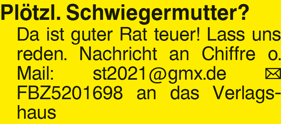 Plötzl. Schwiegermutter? Plötzl. Schwiegermutter? Da ist guter Rat teuer! Lass uns reden. Nachricht an Chiffre o. Mail: st2021@gmx.de FBZ5201698 an das Verlagshaus