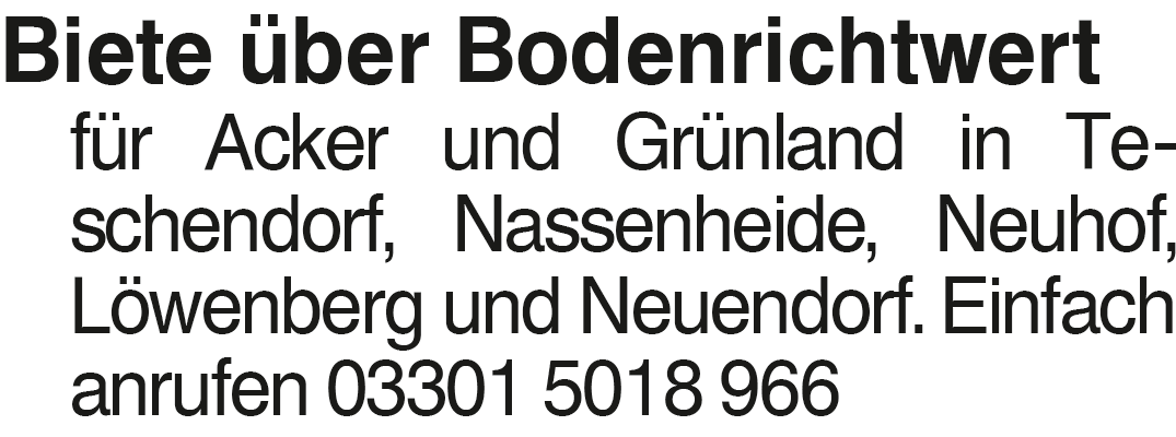 Biete über Bodenrichtwert Biete über Bodenrichtwert für Acker und Grünland in Teschendorf, Nassenheide, Neuhof, Löwenberg und Neuendorf. Einfach anrufen 03301 5018 966Das könnte Sie auch interessieren