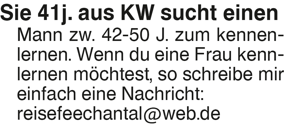 Sie 41j. aus KW sucht ein Sie 41j. aus KW sucht einen Mann zw. 42-50 J. zum kennenlernen. Wenn du eine Frau kennlernen möchtest, so schreibe mir einfach eine Nachricht: reisefeechantal@web.deDas könnte Sie auch interessieren
