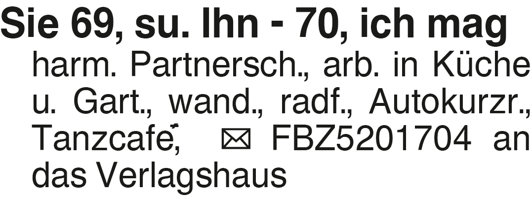 Sie 69, su. Ihn - 70, ich Sie 69, su. Ihn - 70, ich mag harm. Partnersch., arb. in Küche u. Gart., wand., radf., Autokurzr., Tanzcafe¯´, FBZ5201704 an das VerlagshausDas könnte Sie auch interessieren