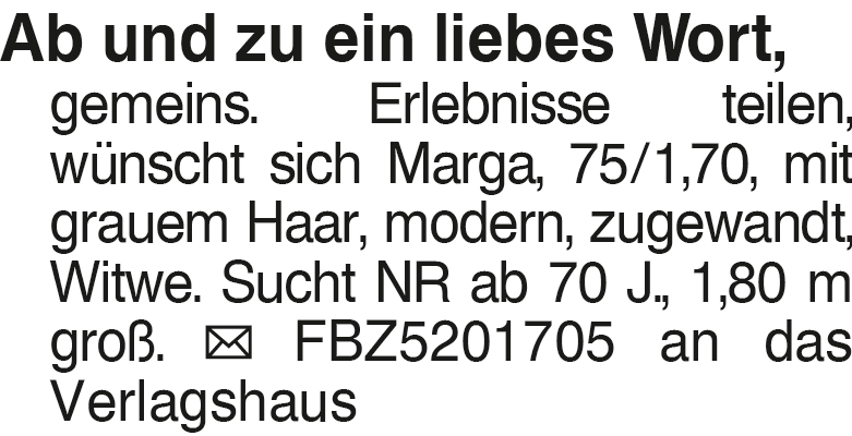 Ab und zu ein liebes Wort Ab und zu ein liebes Wort, gemeins. Erlebnisse teilen, wünscht sich Marga, 75/1,70, mit grauem Haar, modern, zugewandt, Witwe. Sucht NR ab 70 J., 1,80 m groß. FBZ5201705 an das VerlagshausDas könnte Sie auch interessieren