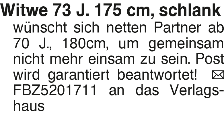Witwe 73 J. 175 cm, schla Witwe 73 J. 175 cm, schlank wünscht sich netten Partner ab 70 J., 180cm, um gemeinsam nicht mehr einsam zu sein. Post wird garantiert beantwortet! FBZ5201711 an das VerlagshausDas könnte Sie auch interessieren