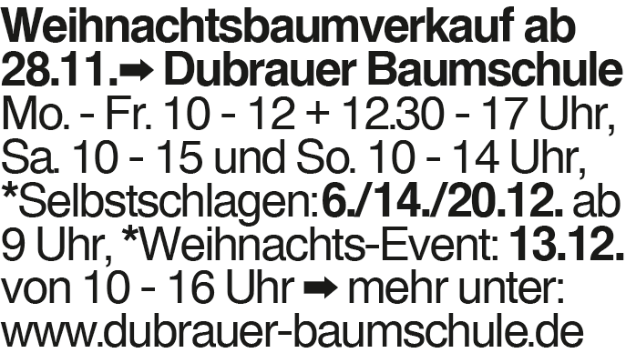 Weihnachtsbaumverkauf ab 28.11. Weihnachtsbaumverkauf ab 28.11. Dubrauer Baumschule Mo. - Fr. 10 - 12 + 12.30 - 17 Uhr, Sa. 10 - 15 und So. 10 - 14 Uhr, Selbstschlagen: 6./14./20.12. ab 9 Uhr, Weihnachts-Event: 13.12. von 10 - 16 Uhr mehr unter: www.dubrauer-baumschule.deDas könnte Sie auch interessieren