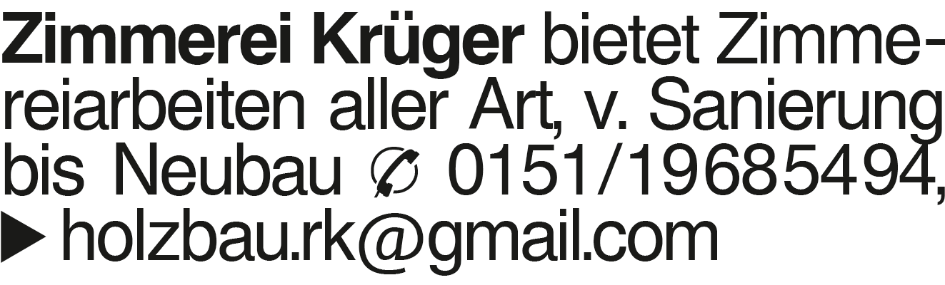 Zimmerei Krüger bietet Zimmereiarbeiten Zimmerei Krüger bietet Zimmereiarbeiten aller Art, v. Sanierung bis Neubau 0151/19 68 54 94, holzbau.rk@gmail.comDas könnte Sie auch interessieren
