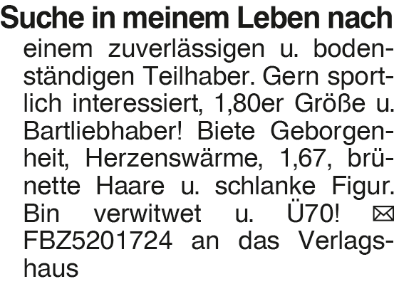 Suche in meinem Leben nac Suche in meinem Leben nach einem zuverlässigen u. bodenständigen Teilhaber. Gern sportlich interessiert, 1,80er Größe u. Bartliebhaber! Biete Geborgenheit, Herzenswärme, 1,67, brünette Haare u. schlanke Figur. Bin verwitwet u. Ü70! FBZ5201724 an das VerlagshausDas könnte Sie auch interessieren