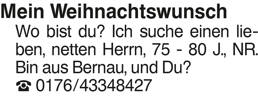 Mein Weihnachtswunsch Mein Weihnachtswunsch Wo bist du? Ich suche einen lieben, netten Herrn, 75 - 80 J., NR. Bin aus Bernau, und Du? 0176/43348427