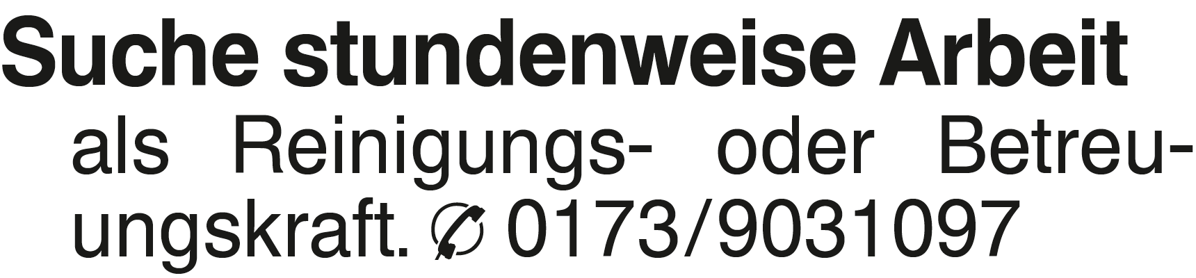 Suche stundenweise Arbeit Suche stundenweise Arbeit als Reinigungs- oder Betreuungskraft. 0173/9031097
