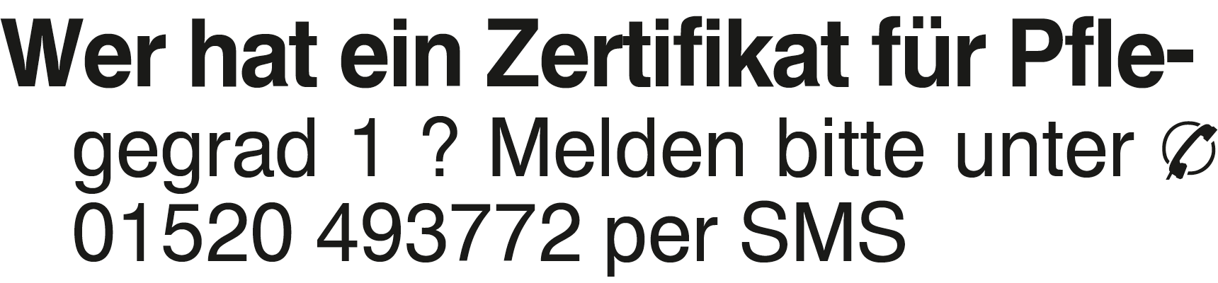 Wer hat ein Zertifikat fü Wer hat ein Zertifikat für Pfle- gegrad 1 ? Melden bitte unter 01520 493772 per SMSDas könnte Sie auch interessieren