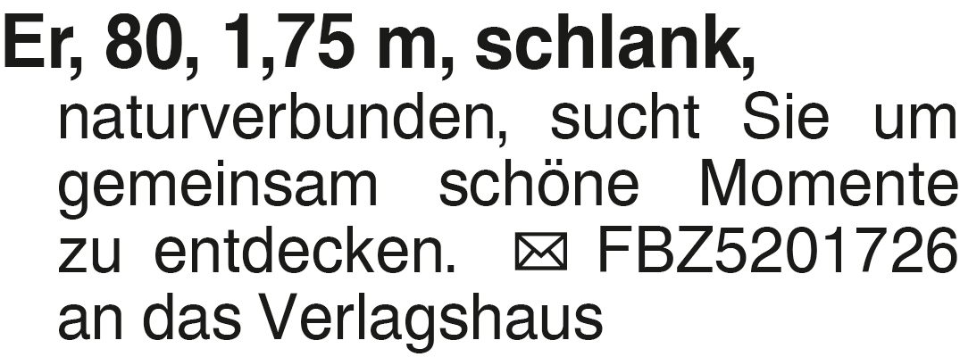 Er 80 1,75 m schlank natu Er, 80, 1,75 m, schlank, naturverbunden, sucht Sie um gemeinsam schöne Momente zu entdecken. FBZ5201726 an das VerlagshausDas könnte Sie auch interessieren