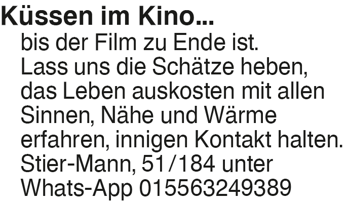 Küssen im Kino... bis der bis der Film zu Ende ist. Lass uns die Schätze heben, das Leben auskosten mit allen Sinnen, Nähe und Wärme erfahren, innigen Kontakt halten. rene.naefe1@gmail.comDas könnte Sie auch interessieren