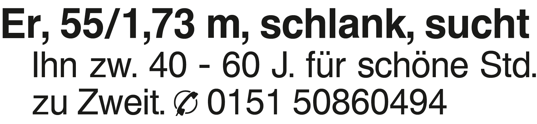 Er, 55/1,73 m, schlank, s Er, 55/1,73 m, schlank, sucht Ihn zw. 40 - 60 J. für schöne Std. zu Zweit. 0151 50860494Das könnte Sie auch interessieren