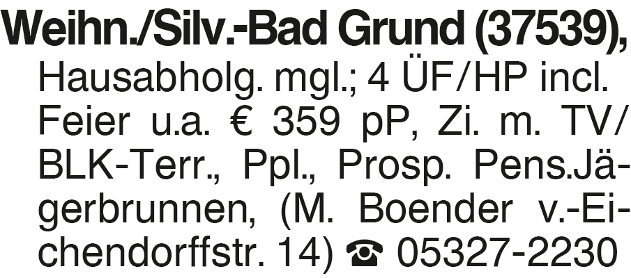 Weihn./Silv.-Bad Grund (3 Weihn./Silv.-Bad Grund (37539), Hausabholg. mgl.; 4 ÜF/HP incl. Feier u.a. EUR 359 pP, Zi. m. TV/BLK-Terr., Ppl., Prosp. Pens.Jägerbrunnen, (M. Boender v.-Eichendorffstr. 14) 05327-2230Kontakt