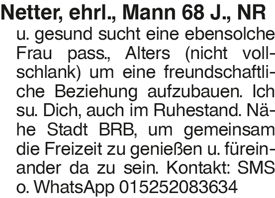 Netter, ehrl., Mann 68 J. Netter, ehrl., Mann 68 J., NR u. gesund sucht eine ebensolche Frau pass., Alters (nicht vollschlank) um eine freundschaftliche Beziehung aufzubauen. Ich su. Dich, auch im Ruhestand. Nähe Stadt BRB, um gemeinsam die Freizeit zu genießen u. füreinander da zu sein. Kontakt: SMS o. WhatsApp 015252083634Das könnte Sie auch interessieren