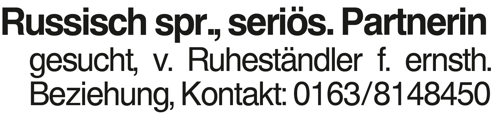 Russisch spr., seriös. Pa Russisch spr., seriös. Partnerin gesucht, v. Ruheständler f. ernsth. Beziehung, Kontakt: 0163/8148450Das könnte Sie auch interessieren