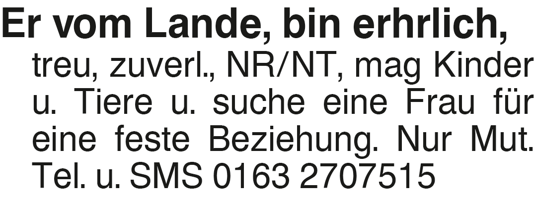 Er vom Lande, bin erhrlic Er vom Lande, bin erhrlich, treu, zuverl., NR/NT, mag Kinder u. Tiere u. suche eine Frau für eine feste Beziehung. Nur Mut. Tel. u. SMS 0163 2707515Das könnte Sie auch interessieren