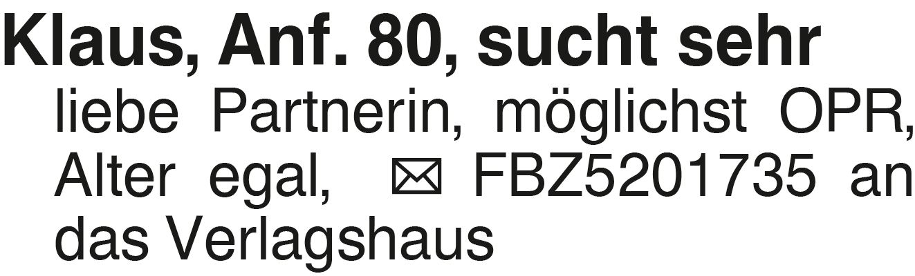 Klaus, Anf. 80, sucht seh Klaus, Anf. 80, sucht sehr liebe Partnerin, möglichst OPR, Alter egal, FBZ5201735 an das VerlagshausDas könnte Sie auch interessieren