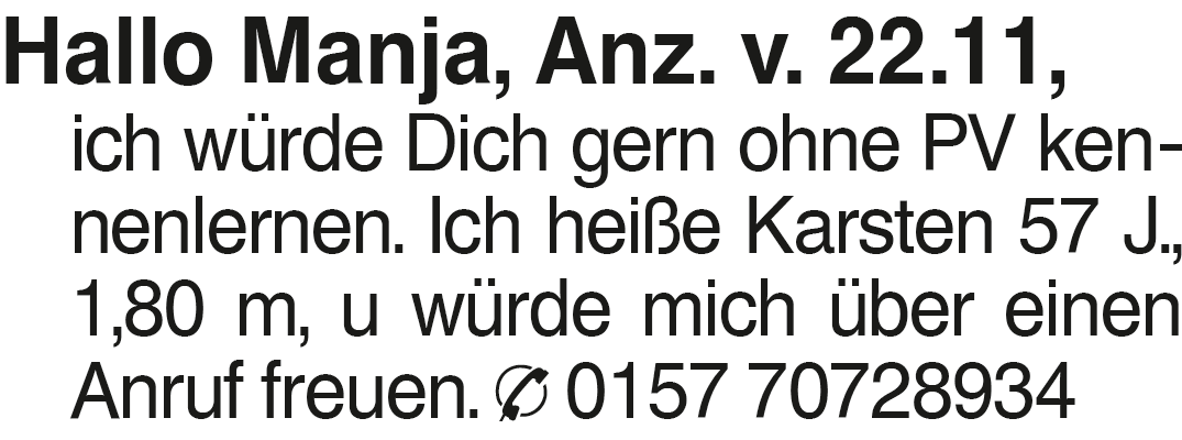 Hallo Manja, Anz. v. 22.1 Hallo Manja, Anz. v. 22.11, ich würde Dich gern ohne PV kennenlernen. Ich heiße Karsten 57 J., 1,80 m, u würde mich über einen Anruf freuen. 0157 70728934Das könnte Sie auch interessieren