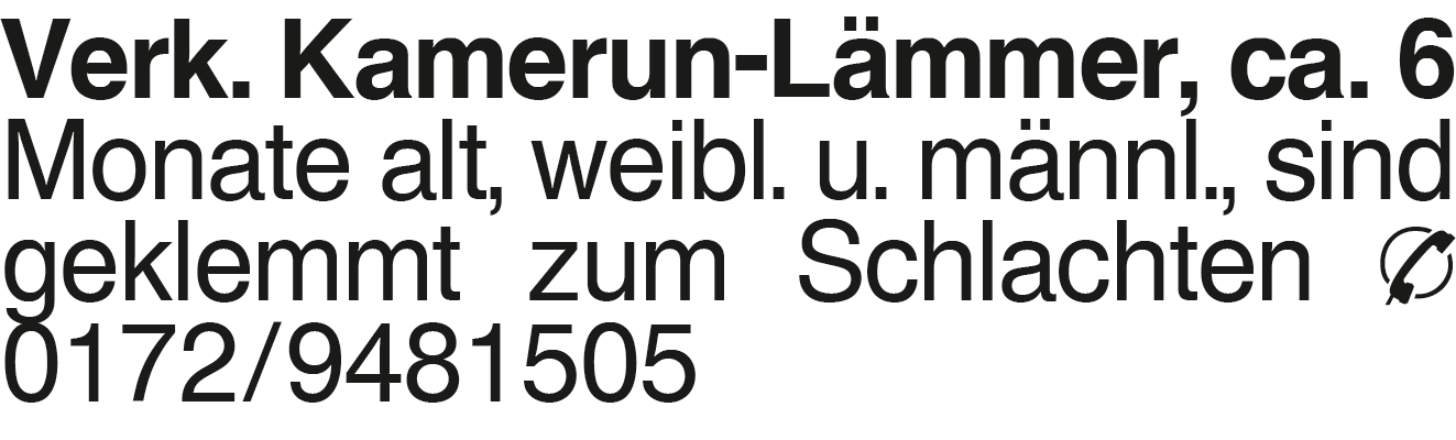 Verk. Kamerun-Lämmer, wei Verk. Kamerun-Lämmer, ca. 6 Monate alt, weibl. u. männl., sind geklemmt zum Schlachten 0172/9481505Das könnte Sie auch interessieren