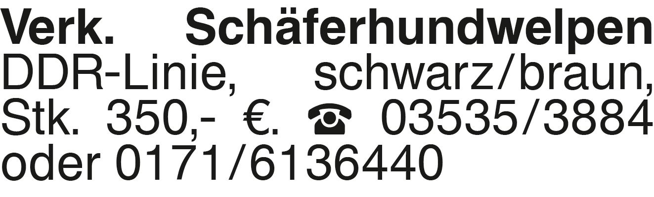 Verk. Schäferhundwelpen D Verk. Schäferhundwelpen DDR-Linie, schwarz/braun, Stk. 350,- EUR. 03535/3884 oder 0171/6136440Das könnte Sie auch interessieren