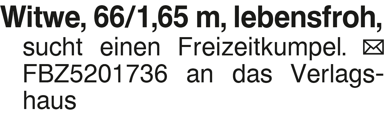 Witwe, 66/1,65 m, lebensf Witwe, 66/1,65 m, lebensfroh, sucht einen Freizeitkumpel. FBZ5201736 an das VerlagshausDas könnte Sie auch interessieren