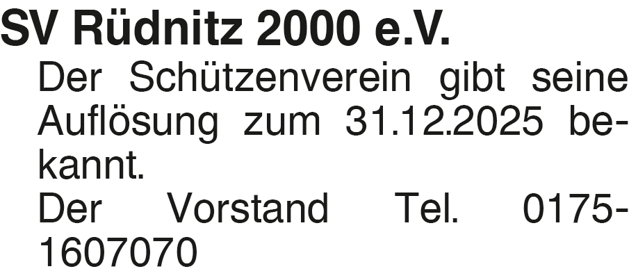 SV Rüdnitz 2000 e.V. Der Der Schützenverein gibt seine Auflösung zum 31.12.2025 bekannt. Der Vorstand Tel. 0175-1607070