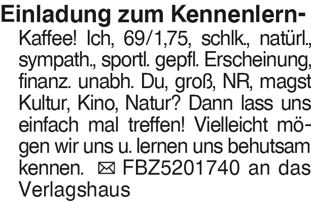 Einladung zum Kennenlern- Einladung zum Kennenlern- Kaffee! Ich, 69/1,75, schlk., natürl., sympath., sportl. gepfl. Erscheinung, finanz. unabh. Du, groß, NR, magst Kultur, Kino, Natur? Dann lass uns einfach mal treffen! Vielleicht mögen wir uns u. lernen uns behutsam kennen. FBZ5201740 an das VerlagshausDas könnte Sie auch interessieren