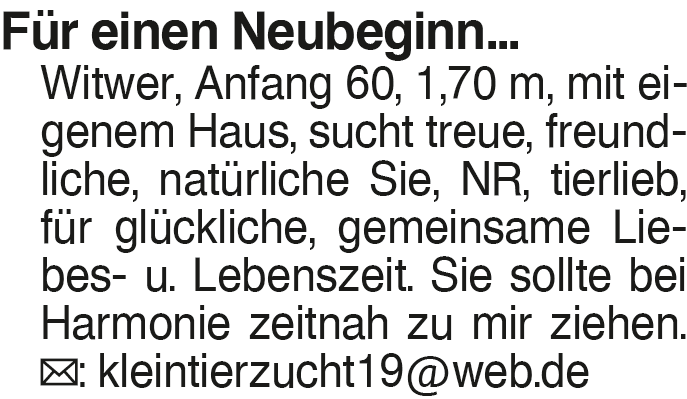 Für einen Neubeginn Witwe Für einen Neubeginn... Witwer, Anfang 60, 1,70 m, mit eigenem Haus, sucht treue, freundliche, natürliche Sie, NR, tierlieb, für glückliche, gemeinsame Liebes- u. Lebenszeit. Sie sollte bei Harmonie zeitnah zu mir ziehen. : kleintierzucht19@web.deDas könnte Sie auch interessieren