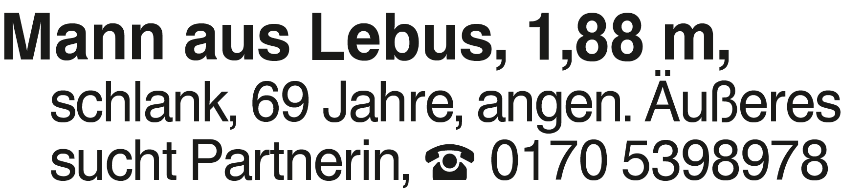 Mann aus Lebus, 1,88 m, s Mann aus Lebus, 1,88 m, schlank, 69 Jahre, angen. Äußeres sucht Partnerin, 0170 5398978Das könnte Sie auch interessieren
