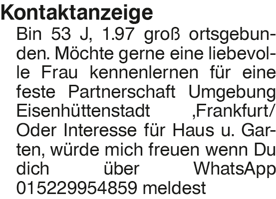 Kontaktanzeige Bin 53 J, Bin 53 J, 1.97 groß ortsgebunden. Möchte gerne eine liebevolle Frau kennenlernen für eine feste Partnerschaft Umgebung Eisenhüttenstadt ,Frankfurt/ Oder Interesse für Haus u. Garten, würde mich freuen wenn Du dich über WhatsApp 015229954859 meldest Tel. (033654) 494074, sigbrummack@gmx.deDas könnte Sie auch interessieren