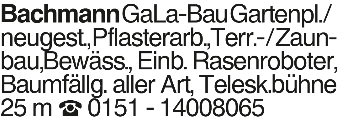 Bachmann GaLa-BauGartenpl. Bachmann GaLa-Bau Gartenpl./ neugest., Pflasterarb.,Terr.-/Zaun- bau,Bewäss., Einb. Rasenroboter, Baumfällg. aller Art, Telesk.bühne 25 m 0151 - 14008065Das könnte Sie auch interessieren