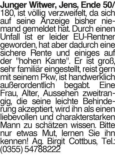 Jens Junger Witwer, Jens, Ende 50/180, ist völlig verzweifelt, da sich auf seine Anzeige bisher niemand gemeldet hat. Durch einen Unfall ist er leider EU-Rentner geworden, hat aber dadurch eine sichere Rente und einiges auf der hohen Kante . Er ist groß, sehr familiär eingestellt, reist gern mit seinem Pkw, ist handwerklich außerordentlich begabt. Eine Frau, Alter, Aussehen zweitrangig, die seine leichte Behinderung akzeptiert, wird ihn als einen liebevollen und charakterstarken Mann zu schätzen wissen. Bitte nur etwas Mut, lernen Sie ihn kennen! Ag. Birgit Cottbus, Tel.: (0355) 54788222Das könnte Sie auch interessieren