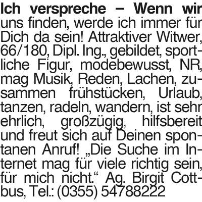 Attraktiver Witwer, 66 Dipl. Ing., Ich verspreche # Wenn wir uns finden, werde ich immer für Dich da sein! Attraktiver Witwer, 66/180, Dipl. Ing., gebildet, sportliche Figur, modebewusst, NR, mag Musik, Reden, Lachen, zusammen frühstücken, Urlaub, tanzen, radeln, wandern, ist sehr ehrlich, großzügig, hilfsbereit und freut sich auf Deinen spontanen Anruf! Die Suche im Internet mag für viele richtig sein, für mich nicht. Ag. Birgit Cottbus, Tel.: (0355) 54788222Das könnte Sie auch interessieren