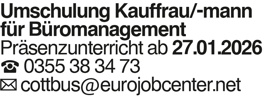 Umschulung Kauffrau/-mann für Büro... Umschulung Kauffrau/-mann für Büromanagement Präsenzunterricht ab 27.01.2026 0355 38 34 73 cottbus@eurojobcenter.netKontakt