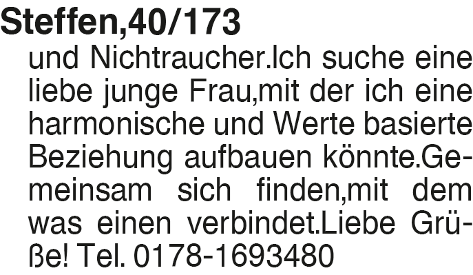 Steffen,40/173 und Nichtr und Nichtraucher.Ich suche eine liebe junge Frau,mit der ich eine harmonische und Werte basierte Beziehung aufbauen könnte.Gemeinsam sich finden,mit dem was einem verbindet.Liebe Grüße! Tel. 0178-1693480Das könnte Sie auch interessieren