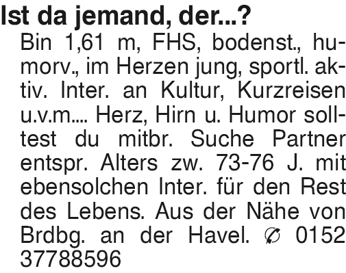 Ist da jemand, der...? Bi Ist da jemand, der...? Bin 1,61 m, FHS, bodenst., humorv., im Herzen jung, sportl. aktiv. Inter. an Kultur, Kurzreisen u.v.m.... Herz, Hirn u. Humor solltest du mitbr. Suche Partner entspr. Alters zw. 73-76 J. mit ebensolchen Inter. für den Rest des Lebens. Aus der Nähe von Brdbg. an der Havel. 0152 37788596Das könnte Sie auch interessieren