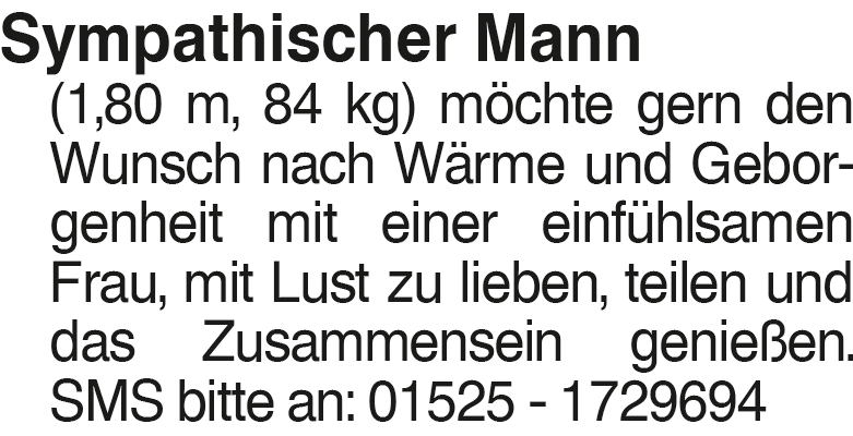 Sympathischer Mann (1,80 Sympathischer Mann (1,80 m, 84 kg) möchte gern den Wunsch nach Wärme und Geborgenheit mit einer einfühlsamen Frau, mit Lust zu lieben, teilen und das Zusammensein genießen. SMS bitte an: 01525 - 1729694Das könnte Sie auch interessieren
