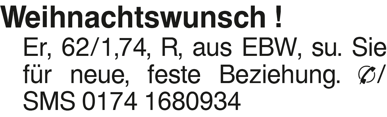 Er, 62/1,74, R, aus EBW, Weihnachtswunsch ! Er, 62/1,74, R, aus EBW, su. Sie für neue, feste Beziehung. /SMS 0174 1680934Das könnte Sie auch interessieren
