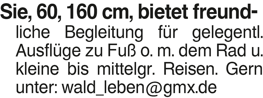 Sie, 60, 160 cm, bietet f Sie, 60, 160 cm, bietet freund- liche Begleitung für gelegentl. Ausflüge zu Fuß o. m. dem Rad u. kleine bis mittelgr. Reisen. Gern unter: wald_leben@gmx.deDas könnte Sie auch interessieren