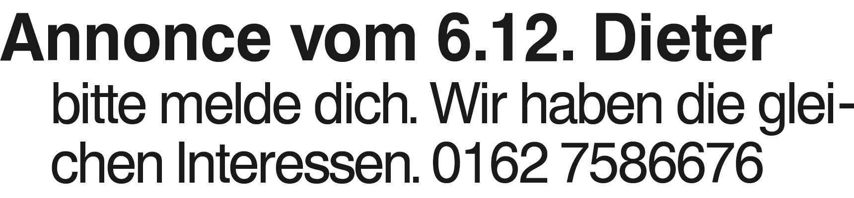 Annonce vom 6.12. Dieter Annonce vom 6.12. Dieter bitte melde dich. Wir haben die gleichen Interessen. 0162 7586676Das könnte Sie auch interessieren