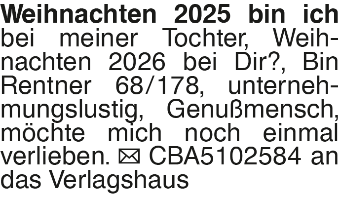 Weihnachten 2025 bin ich Weihnachten 2025 bin ich bei meiner Tochter, Weihnachten 2026 bei Dir?, Bin Rentner 68/178, unternehmungslustig, Genußmensch, möchte mich noch einmal verlieben. CBA5102584 an das VerlagshausDas könnte Sie auch interessieren