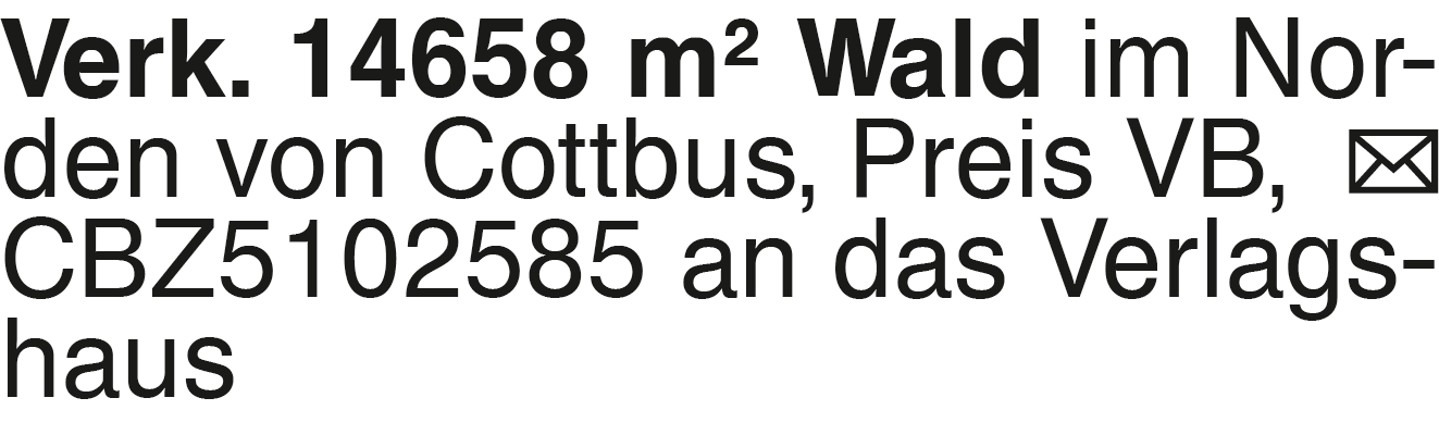 Verk. 14658 m2 Wald im No Verk. 14658 m2 Wald im Norden von Cottbus, Preis VB, CBZ5102585 an das VerlagshausDas könnte Sie auch interessieren