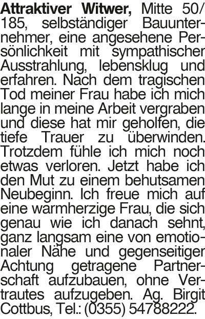 Attrakt. Witwer Mitte 50 Attraktiver Witwer, Mitte 50/185, selbständiger Bauunternehmer, eine angesehene Persönlichkeit mit sympathischer Ausstrahlung, lebensklug und erfahren. Nach dem tragischen Tod meiner Frau habe ich mich lange in meine Arbeit vergraben und diese hat mir geholfen, die tiefe Trauer zu überwinden. Trotzdem fühle ich mich noch etwas verloren. Jetzt habe ich den Mut zu einem behutsamen Neubeginn. Ich freue mich auf eine warmherzige Frau, die sich genau wie ich danach sehnt, ganz langsam eine von emotionaler Nähe und gegenseitiger Achtung getragene Partnerschaft aufzubauen, ohne Vertrautes aufzugeben. Ag. Birgit Cottbus, Tel.: (0355) 54788222.Das könnte Sie auch interessieren
