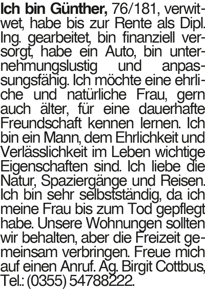 Günther Ich bin Günther, 76/181, verwitwet, habe bis zur Rente als Dipl. Ing. gearbeitet, bin finanziell versorgt, habe ein Auto, bin unternehmungslustig und anpassungsfähig. Ich möchte eine ehrliche und natürliche Frau, gern auch älter, für eine dauerhafte Freundschaft kennen lernen. Ich bin ein Mann, dem Ehrlichkeit und Verlässlichkeit im Leben wichtige Eigenschaften sind. Ich liebe die Natur, Spaziergänge und Reisen. Ich bin sehr selbstständig, da ich meine Frau bis zum Tod gepflegt habe. Unsere Wohnungen sollten wir behalten, aber die Freizeit gemeinsam verbringen. Freue mich auf einen Anruf. Ag. Birgit Cottbus, Tel.: (0355) 54788222.Das könnte Sie auch interessieren
