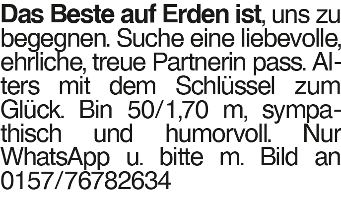 Das Beste auf Erden ist, Das Beste auf Erden ist, uns zu begegnen. Suche eine liebevolle, ehrliche, treue Partnerin pass. Alters mit dem Schlüssel zum Glück. Bin 50/1,70 m, sympathisch und humorvoll. Nur WhatsApp u. bitte m. Bild an 0157/76782634Das könnte Sie auch interessieren
